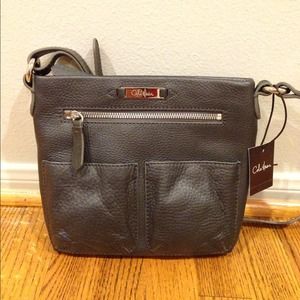 New Gunmetal leather crossbody bag with 2 front pockets and back open pocket. Inside zipper compartment. Size 9x9. Adjustable 42 inch strap,
