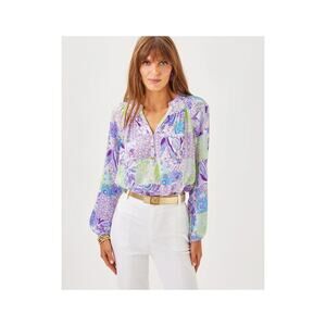 The Lilly Pulitzer Women's Juicy Story Patch Silk Elsa Top in XL features a vibrant multicolor pattern with a V-neckline and long sleeves, making it a stylish choice for casual occasions. Made from luxurious silk fabric, this blouse offers a comfortable regular fit and a convenient pullover closure. The basic style of this top from the Lilly Pulitzer brand ensures a timeless addition to any woman's wardrobe.