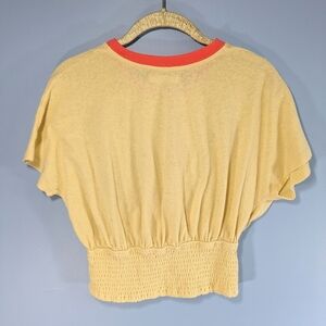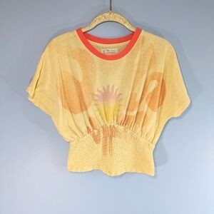 Super cute yellow dolman sleeve cropped thin knit top with sun print by We the Free from Free People.