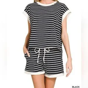 Zenana Striped Black White Lounge Matching Short Sleeve Short Set