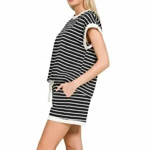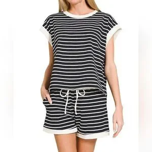 Color: Black Features: Basic Style, Drawstring, Pocketed Care Instructions: Machine wash cold. Tumble dry low.Stylish black and white striped lounge set. Features a comfortable top and shorts with drawstring.
