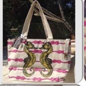 This spacious tote fits comfortably over the shoulder and is perfect for carrying all of your beach essentials. Has 3 inner pouch pockets. D ring on the side for clipping keys. Inner snap closure. 100% cotton canvas outer, nylon lining with T/F logo pattern. 12" H x 20" W x 6.5" D. Handle drop 10”. Retails for $75. Comes to you in its sealed packaging with tags attached. Smaller pouch not available. Limited edition. Sold out in stores and online. Great for gifts.