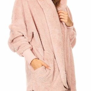 T-party fuzzy hooded jacket features a hood, pockets, raw and exposed edged seams, ribbed armband and is SUPER soft! Make this your go to throw over those brisk winter days great with a pair of Skinnys and boots care hand or machine wash fiber content 100% polyester.