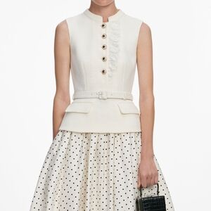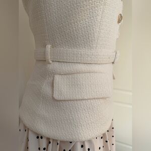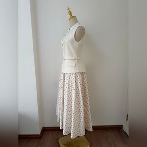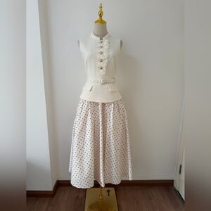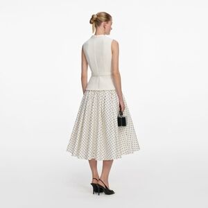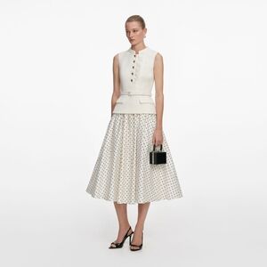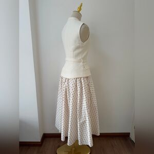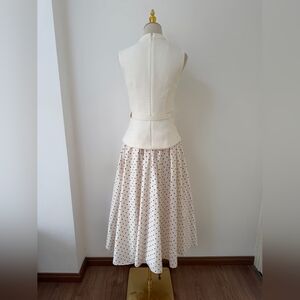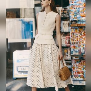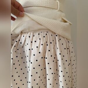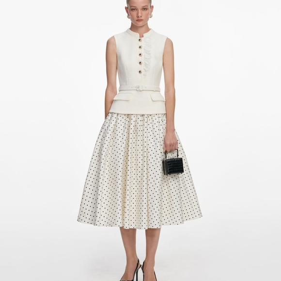 polka dot print skirt brings light-hearted ease to this fit-and-flare midi dress. Its cream bouclé top and belted waist exude elegant poise – add heels for work cocktails and trips to the opera.