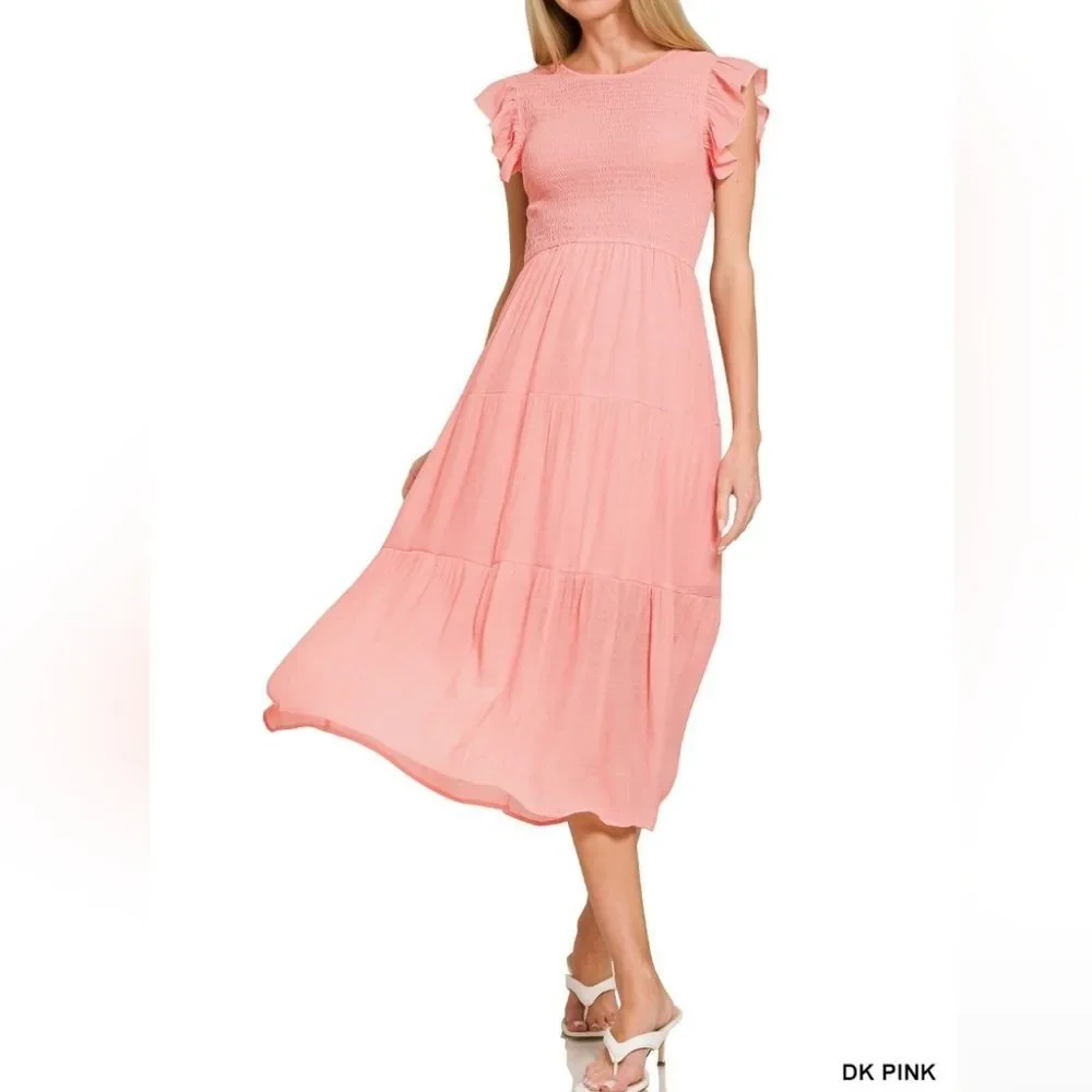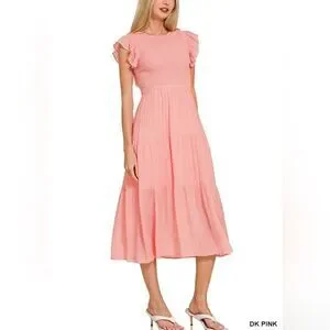 Zenana Women's Casual Woven Smocked Ruffle Sleeve Midi Dress in Light Pink