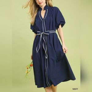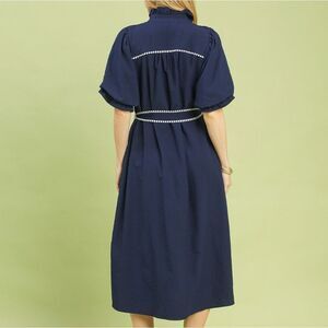 Umgee Women's Quite Luxury Ruffle Collar Belted Midi Dark Blue Dress Stripe Trim