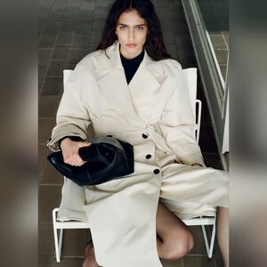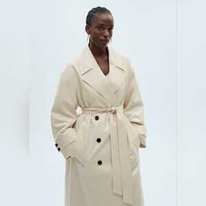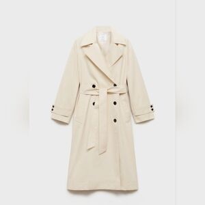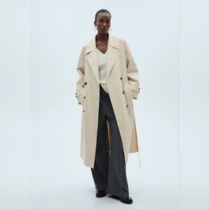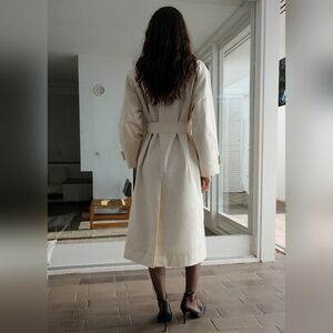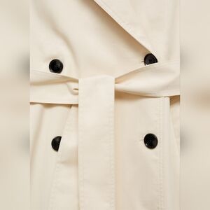 Lapel-collar V-neck collar. Notched lapels. Long sleeves. Removable belt. Two side pockets. Double button fastening. Inner lining.