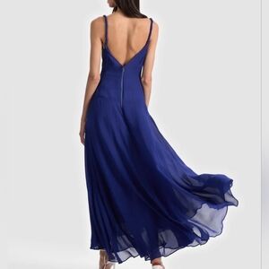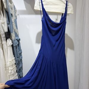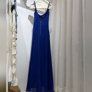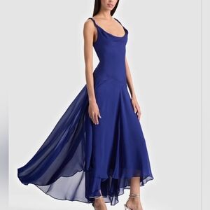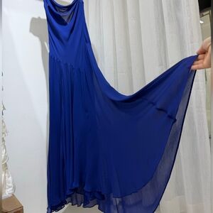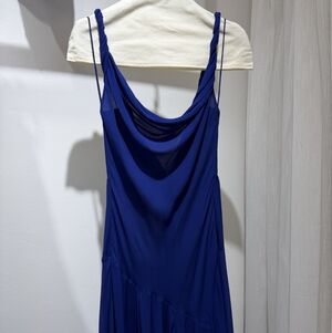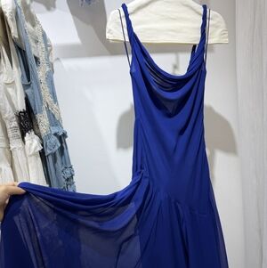 Fluid and striking, this is the entrance-maker you’ve been looking for. Our Sarika blue slip dress is cut from soft viscose georgette, featuring twisted straps and a draped cowl neckline for feminine dimension. An open back and asymmetric seam introduce movement and visual interest. The bold blue hue enhances its depth.