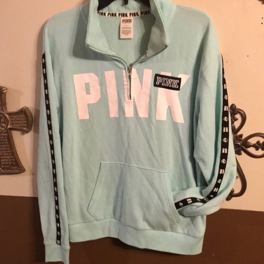 Worn twice, new condition. 3/4 zip pullover with kangaroo pocket. Nice and bright teal color with no cracking on lettering.