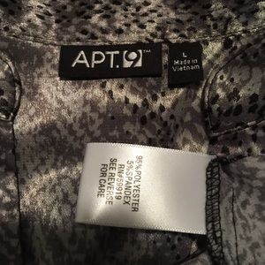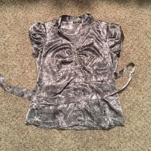 Silver, grey, and black shiny silky python print top with short sleeves and button down front. Same print belt is not attached and top can be worn without belt. Top also has princess darting for a pretty feminine fit.