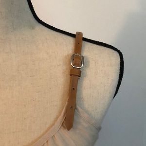 Great condition. Layered ruffled skirt. Cream, coral and brown. With brown buckled straps and buttons on front.