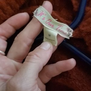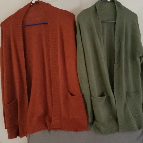 One is army green the other is a burnt orange wanting to sell both together but if interested in only one . I can make adjustments to post ! They are open cardigan that fall right at the butt , with pockets . Worn once just not my style.