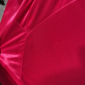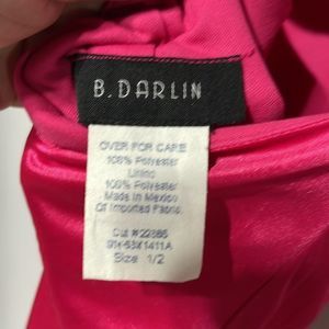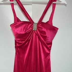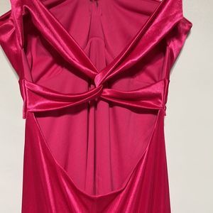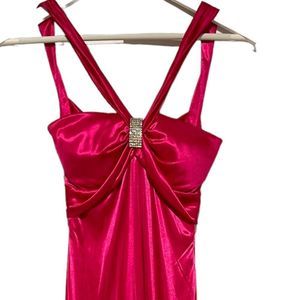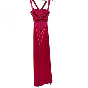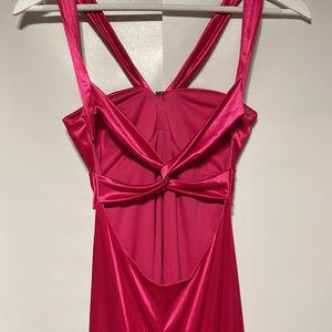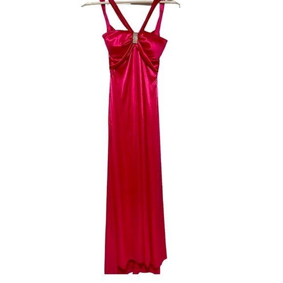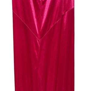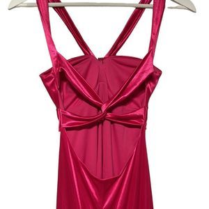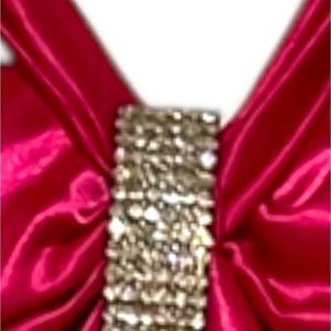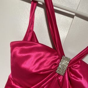 This dress is actually beautiful Barbie core cocktail dress but has a few flaws so was last years Barbie costume. It’s a bright pink , has a beautiful rhinestone brooch on front, cross cross back leaving a lot of the back exposed. There are a few spots the first being a small area on front see photo 7 and the other is the back of the dress there are VERY light fingerprints from my make up on my hands picking up the dress bottom see photo 15. This could be dry cleaned I’m sure if you wanted to use it as a cocktail dress but I’m not 100% the flaws would come out. Size 1/2 so smaller sized. Please see measurements.
