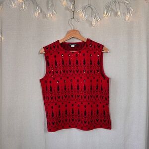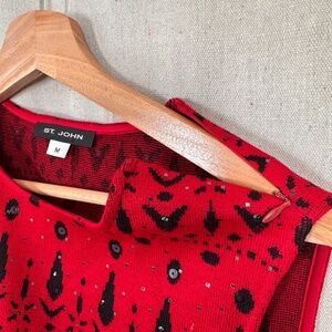 Pretty St. John red shell sleeveless knit top in size small. Zipper on shoulder. Black designs with black sequins.