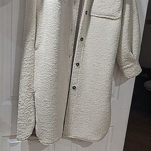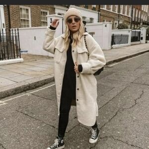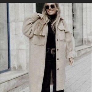 The viral perfect teddy coat. I say "teddy" because this is not sherpa material, and that's close to how this material is.All buttons in place, falls well on body, it's not stiff.