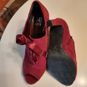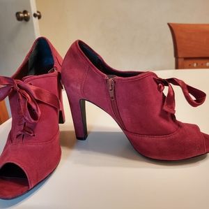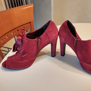 Adorable! Cranberry colored, genuine suede booties with decorative ribbon lace up front, peep toe and side zipper. Worn once. In excellent condition. It breaks my heart to part with these, but I had foot surgery and I can't wear high heels anymore. My loss is your gain.