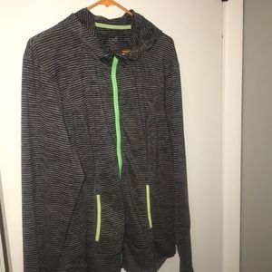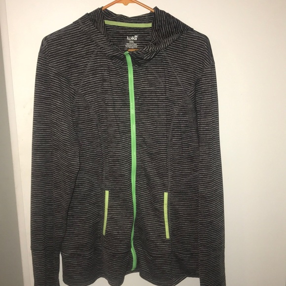 Hooded zip up. Stretchy material. Good for working out or relaxing. Very comfortable.