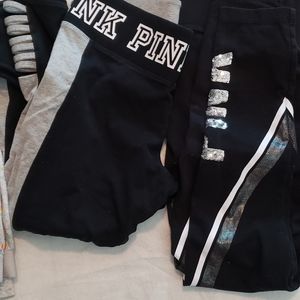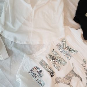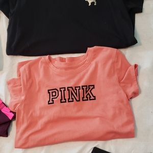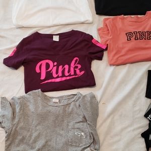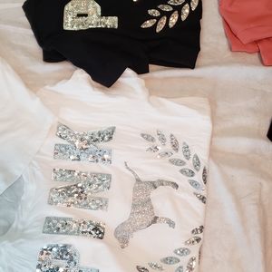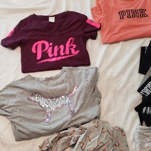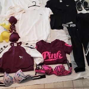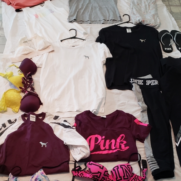 Selling new and gently used pink items. U get everything in this picture but the bras and flip flops. There are 11 items the sizes are xs to medium. Im a medium to large and they all fit me. They are all oversized. I don't have enough space to list each one. The black and white bling bog tops have been worn once. The open back nwt. And the white bralette nwot. No refunds or returns no rips or stains all in great condition. Please message me for any questions