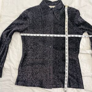 Rare Glam Vintage 1970’s silver metallic & black blouse & pants set by Lady Manhattan. Button down top has a wide collar, Disco vibes! It has long sleeves with buttoned cuffs. The matching pants are a tighter fit through waist & hips, stretchy material though, and the legs are wide and flowy. Stretchy waistband with rhinestone buttons & zipper. Excellent vintage condition with no visible flaws. This retro top & pants set is a gem!!