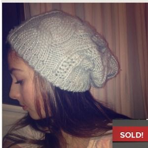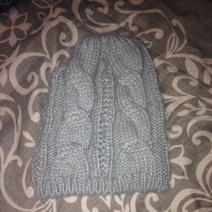 Warm knitted gray beanie. It's the kind that scrunches up in the back with extra material. Really warm and only used a few times.