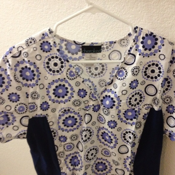 Light blue, dark blue/white floral print Cherokee flexible fit scrub top. New without tags. From a clean non smoking home. Size XL.