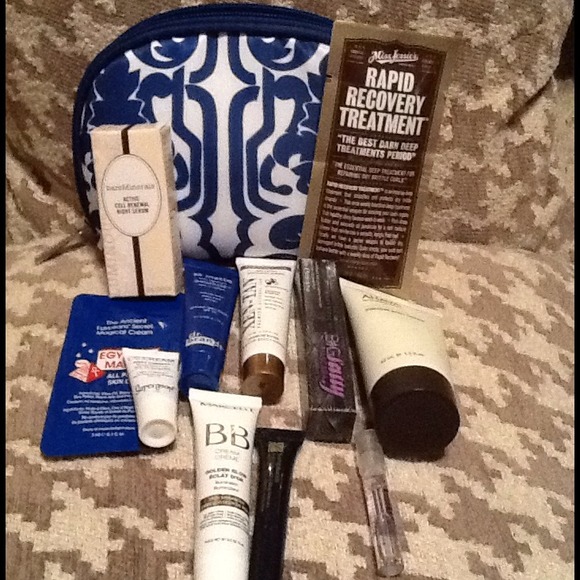 This listing is for a haut look for nordstrom makeup bag with 11 samples from bare minerals, Egyptian magic, xen-tan, miss Jessie's, ahava, dr. Brandt, urban decay, supergoop, Estée Lauder, Marcelle, and Bcbg. Great samples at a great price.