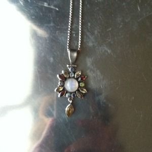 This gorgeous sterling silver pendant has a beautiful Moonstone in the center and surrounding it is, Iolite, Garnet, Peridot, Blue Topaz and Citrine. The marquis dangle is a Citrine. All are AUTHENTIC stones!