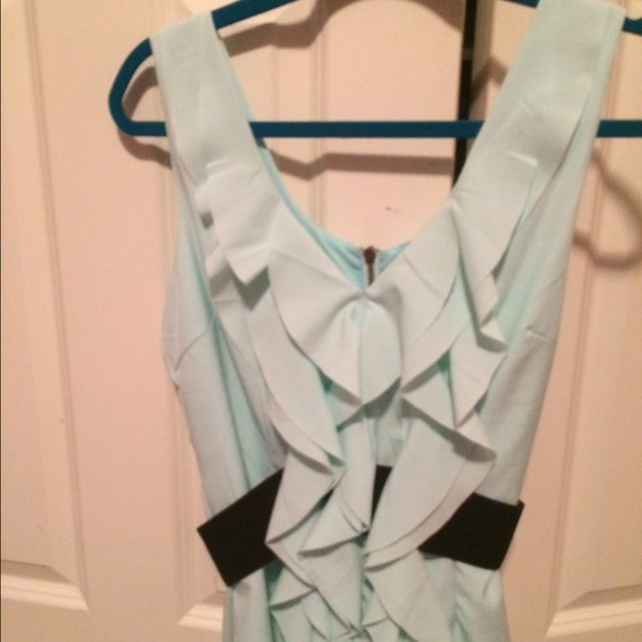 This is a unique and cute shirt. It's a light bright blue with ruffles down the middle and a black very stretchy band. There is a zipper in the back and this shirt is so cute. It's been worn once