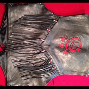 Black leather vest with red roses. Gently used with small section on back of vest that looks slightly worn. Red rose inlay beads, fringes, braid up sides that are adjustable, 2 pockets and button front.