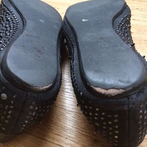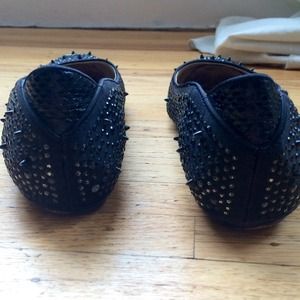 Pre-loved Sam Edelman edgy black flats. Adorned with spikes, sequins and studs, these flats are a nice spin on a plain black staple shoe. These flats have some wear on them: a few missing sequins & some wear on back heel, but they have a lot of mileage left on them. They are an 8.5, but fit a little large. Would fit a 9 better than an 8.5.