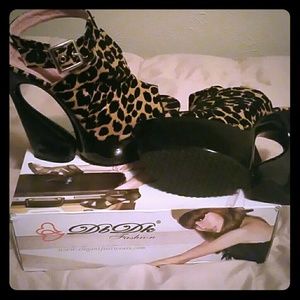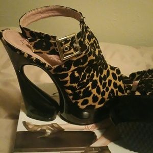 This awesome leopard print shoe turns heads. Worn two times. They look and feel brand new. The black spots are felt. The sole has no visible wear at all. Hey are a 10 but they fit me perfect, I wear 9.5. Shoe game is on point!