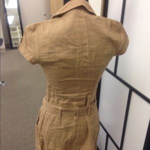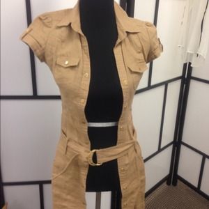 Tan linen safari style dress with belt, button front and gold details. Runs very small - marked an XS but more like an xxs