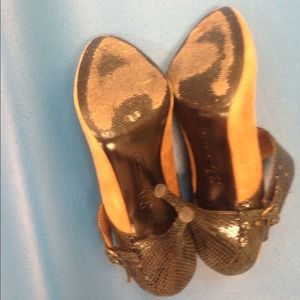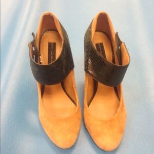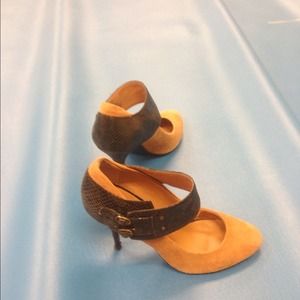 Tan suede and black leather snakeskin pumps. Adjustable buckles on sides. Well worn and accounted for in price