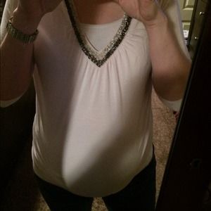 Beautiful and comfortable lightweight 3/4 sleeve shirt with decorative beaded neckline. Shown here on 36 week pregnant woman, so it will be great for 2nd and 3rd trimesters!