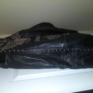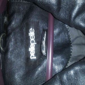 Leather Pelle Pelle coat great inside fabir with inside pocket. Good condition leather with rhinestone symbols in back of the jacket, very bling bling coat. Great coat to stunt on a casual day or a out night with fashion. Original Price $400