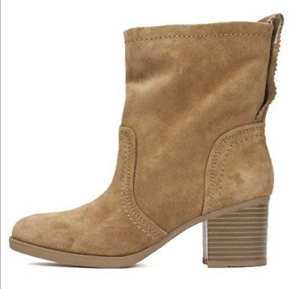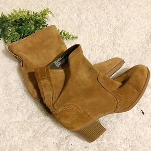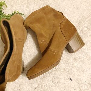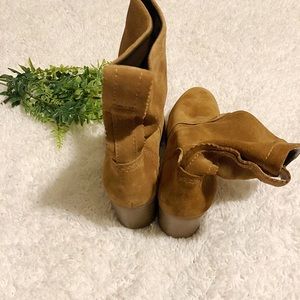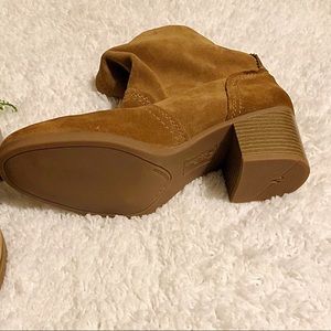 Slouchy silhouette made of genuine suede with a tab for easy on and off. Contrasting stitching adds extra appeal. Two inch heel. Never worn outside!