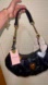 Elegant black shoulder bag with gold chain accents. Features a stylish emblem and decorative bow.