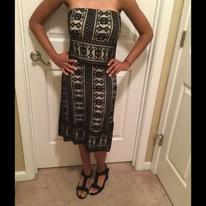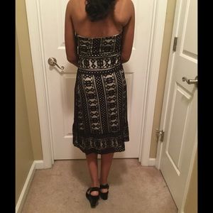 This is a lacy overlay strapless dress. It is Black/white with a unique floral pattern. 85% Nylon 15% Spandex. It is lined inside with a little bit of wear, but nothing that takes away the beauty of the dress.The lining is 95% Rayon 5% spandex. This dress is great to with a bolero if needed for chilly weather.