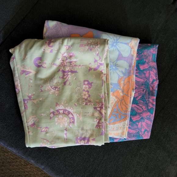 3 new luluroes pants in different patterns one size fits all.