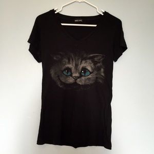 Black Wet Seal v-neck with a Cheshire Cat-like print on the front. Says large but fits like a small/medium. Worn once/twice.