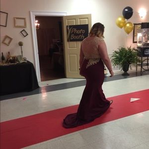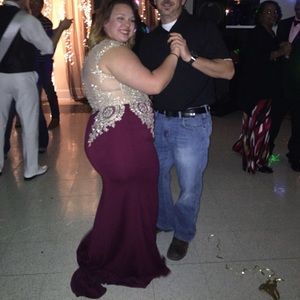 It is Wine/Burgundy in color! Nude at top and some see threw except breast area is covered.. Size 14 in Women's.. absolutely stunning dress.. it has some stretch to it.. My daughter is more of a size 16 and wore it..