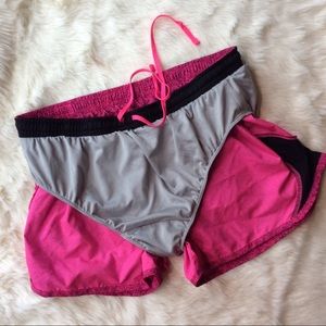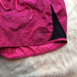 Gently worn Nike shorts. Shorts are a speckled stone/polka dot print, hot pink and black. Black mesh cut out on the sides. Lined with a soft grey lining. Excellent condition. No stains, holes or tears. Not sure if this is a girls youth or adult youth, so please check the measurements with your own!!