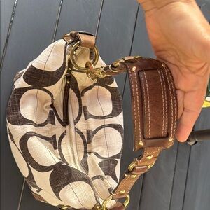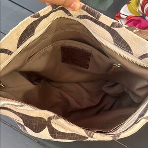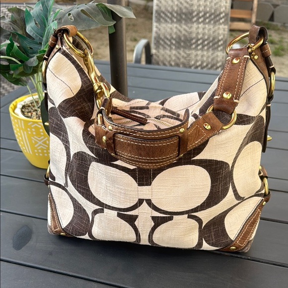 This luxurious Coach hobo bag showcases a sophisticated blend of cream and brown tones, highlighted by the brand's iconic monogram design. Crafted with premium materials, it features a structured silhouette and gold-tone hardware, making it a timeless accessory for any occasion.