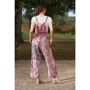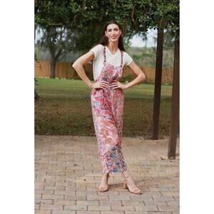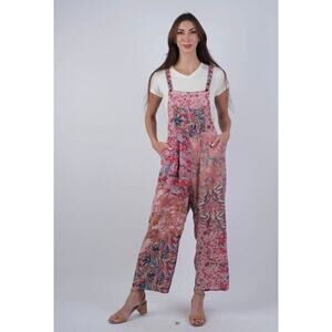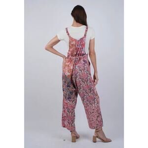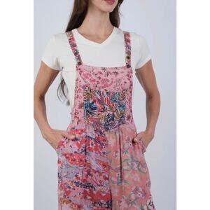 The overalls feature a lively patchwork of pink tones with floral and abstract patterns, creating a boho-inspired look. They offer a relaxed, wide-leg silhouette with adjustable straps and practical pockets for everyday wear.