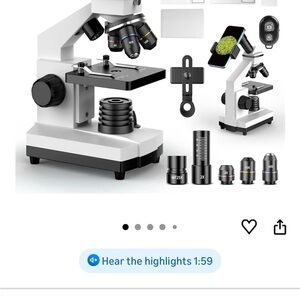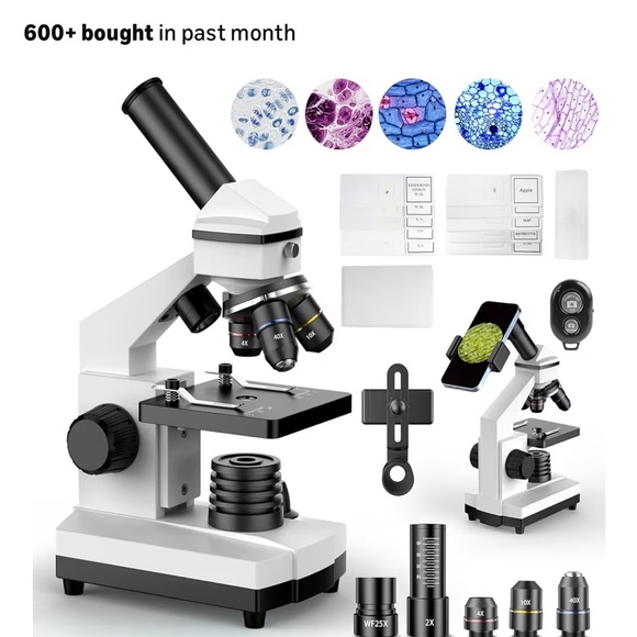 High-quality optical microscope for education and hobby use. Includes multiple objective lenses and eyepieces. Comes with smartphone adapter and remote shutter. Includes prepared slides and sample accessories. Easy to adjust focus and stage clips.