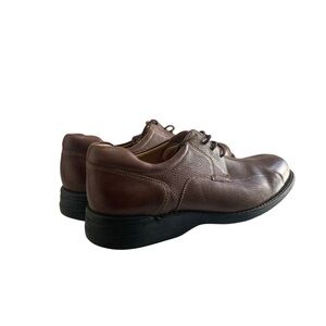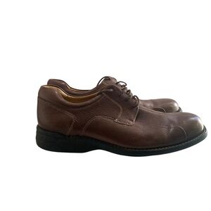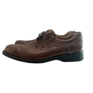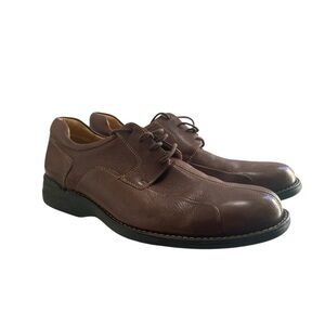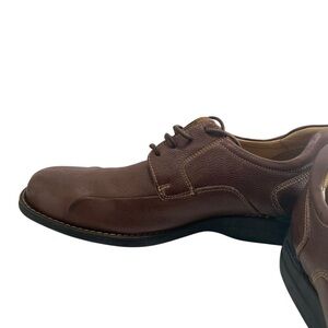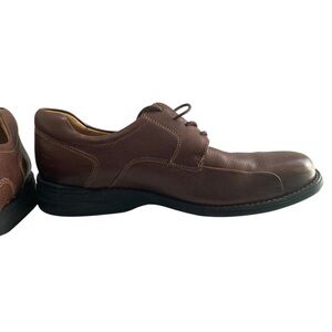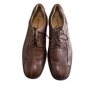 The Johnston & Murphy Sheepskin Leather Split Toe Oxfords are a stylish and high-quality pair of men's dress shoes in size 13M. Made with genuine leather, these brown shoes feature a lace-up closure and a solid pattern. The oxfords have a classic design with a split toe and a leather lining, making them perfect for the office or formal occasions. With features like a comfortable insole and durable outsole, these shoes are ideal for the summer, fall, and spring seasons.