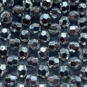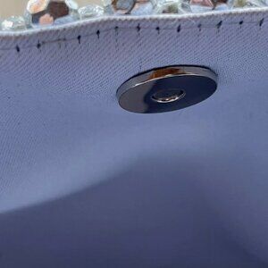 Beaded everywhere in silver facets, including the handles, which are perfectly just long enough to wear over your arm as well. Closes with a magnetic snap.