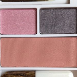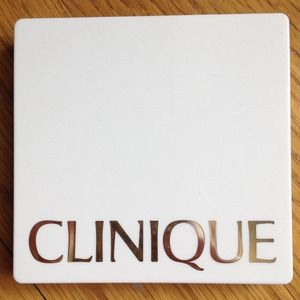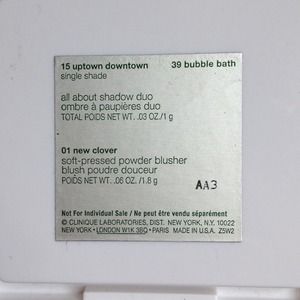 A Clinique compact with two eyeshadow shades (in uptown downtown and bubble bath) and a blush (in new clover). All shades and applicators are completely unused!