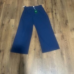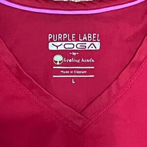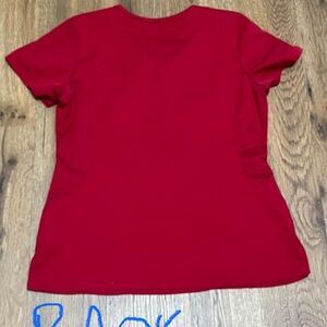 Juliet V Neck Yoga Scrub Top in a vibrant red color. Comfy breathable material w two pockets. Size large. Features stretchy panels on each side to move with you.