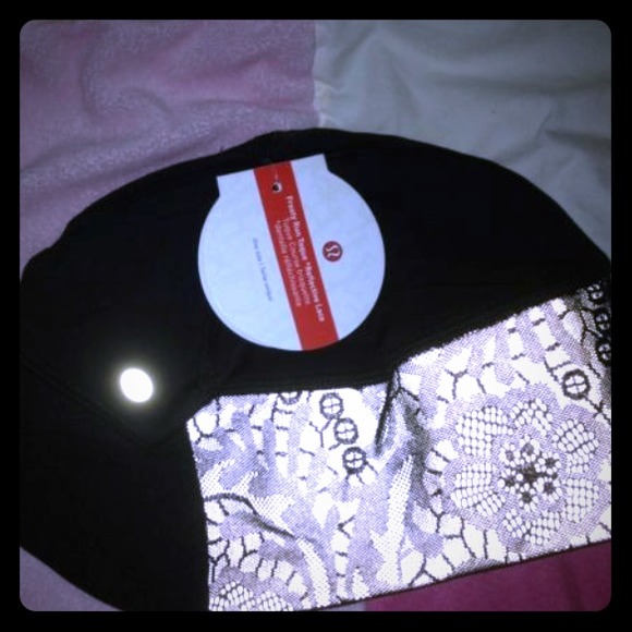 Lululemon beanie cap toque with opening for ponytail and reflective lace for jogging at night.